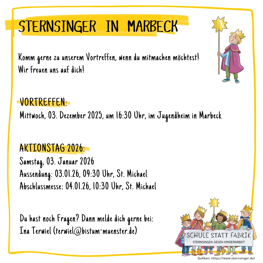 MarbeckKomm gerne zu unserem Vortreffen, wenn du mitmachen möchtest! Wir freuen uns auf dich! VORTREFFEN: Mittwoch, 03. Dezember 2025, um 16:30 Uhr, im Jugendheim in Marbeck AKTIONSTAG 2026: Samstag, 03. Januar 2026 Aussendung: 03.01.26, 09:30 Uhr, St. Michael Abschlussmesse: 04.01.26, 10:30 Uhr, St. Michael Du hast noch Fragen? Dann melde dich gerne bei: Ina Terwiel… Weiterlesen »Sternsinger in Marbeck